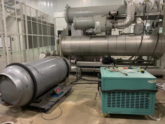 2021年,南京天加空調(diào)由于機組檢修,需要將980Kg制冷劑的R245FA制冷劑從噸瓶往機組里加注,但是由于R245FA制冷劑性質(zhì)特殊,具有壓力低極易液化等特點,所以市場上的回收機大多無法回收此類制冷劑,后經(jīng)介紹得知南京春木可提供定制化冷媒回收機,春木制冷在了解到該客戶的具體工況之后出了一套詳細(xì)的方案,設(shè)備采用高壓縮比四缸無油壓縮機類的冷媒回收機,具有運行壽命長,免維修等特點。